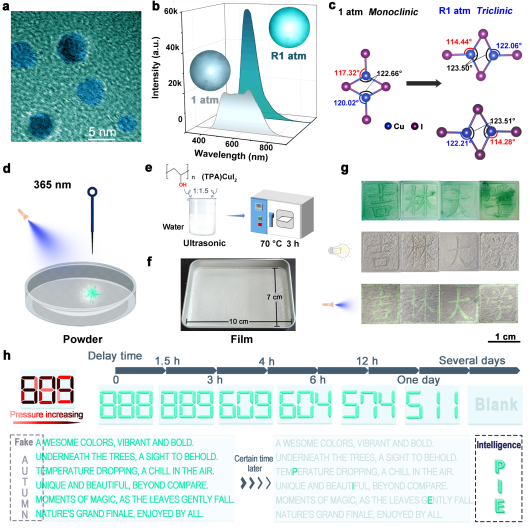 ”样的印章施压时,其压痕处可呈现出显著且可区分的荧光颜色变化。此外,基于常压截获的亚稳相的恢复时间随施加压强阈值而动态变化的特性,开发了压强调控的动态信息防伪系统。例如,通过精确控制压痕的压强参数,可实现特定时间延迟后显示预设数字密钥的功能,抑或在设定时间窗口后,从鱼目混珠的“假情报”中提取真正的加密情报,偏离设定时间窗口后,真正的加密情报自动隐藏于泄露的“假情报”中。该研究为开发适用于压强成像、应力检测与信息加密的高性能压强响应材料提供了新思路。