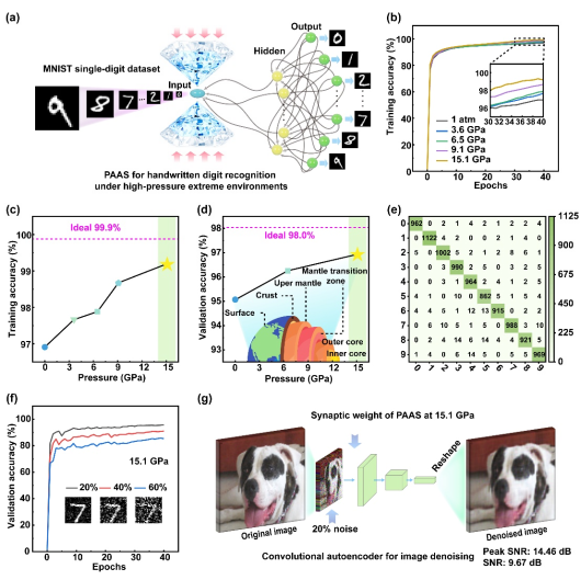 在本研究中,李顺心课题组构建了一种基于VO₂(M1)纳米颗粒的压力自适应人工突触(Pressure-adaptive artificial synapses, PAAS)。该器件能在从常压(1 atm)到15.1 GPa的高压环境下稳定且高性能地工作。其机理在于:从M1相(1 atm)到M1’相(高于15.1 GPa)的相变过程中,压力抑制了VO₂(M1)在光诱导绝缘体-金属相变中的Peierls路径(M1到R结构相变),使得Mott机制(电子相变)占主导。得益于这一机制,PAAS在高压下的仿生可塑性显著增强,其最大配对脉冲易化指数从109.6%提升至155.4%;同时,其突触后电流的线性度也得到改善,Pearson相关系数从0.64提升至0.97。此外,即便在地壳下部的压力环境(约3 GPa)中,PAAS仍能保持完整的仿生学习功能。基于上述性能,该器件成功展示了其在高压神经形态计算中的应用潜力:在手写数字识别任务中实现了97%的准确率,并能基于卷积自编码器完成彩色图像的降噪与重建。